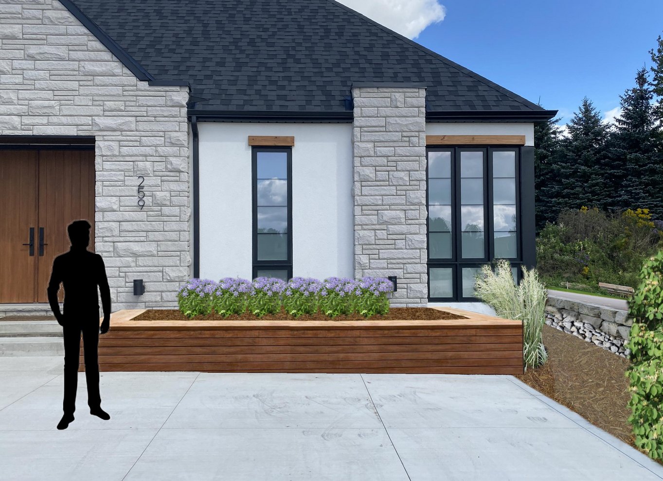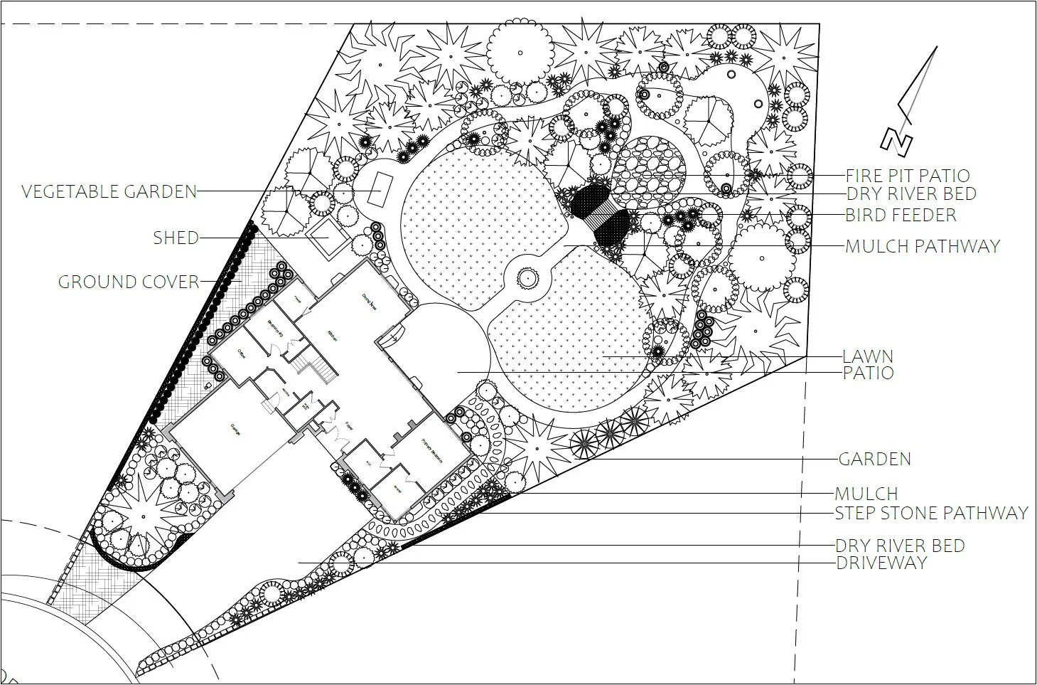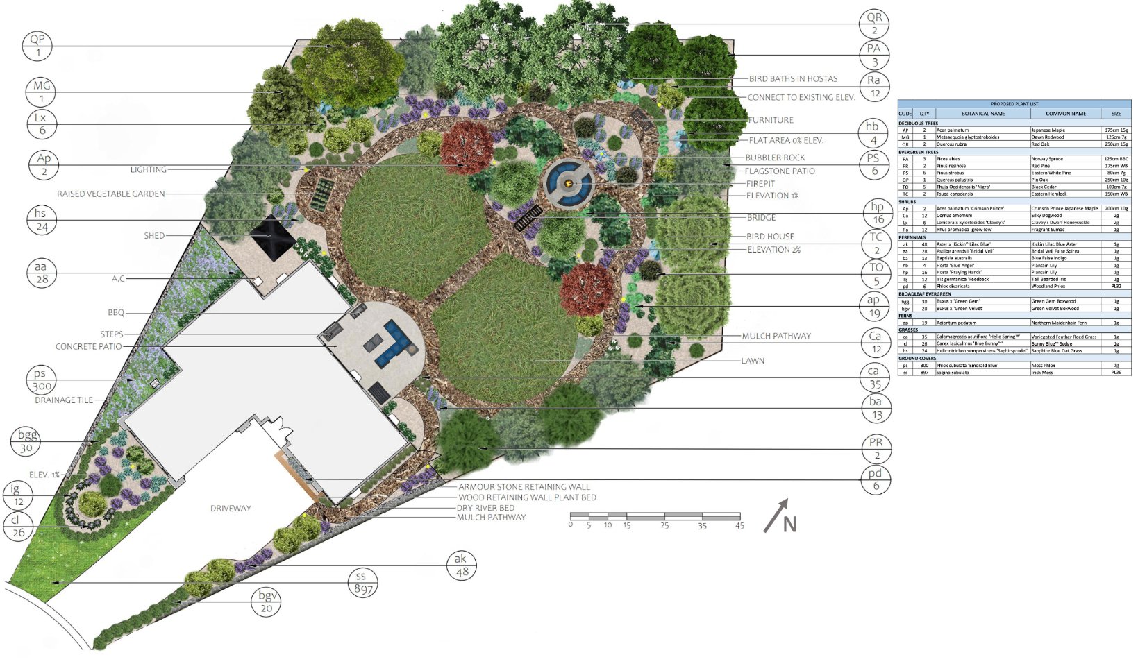 This is a forest themed landscape design for the DeVos family’s backyard of their new home. It included mostly everything from their wish list such as retaining walls, privacy plants, shed, patios, firepit, a water feature, vegetable garden, a bridge and topography. I named it Twilight Canopy because the site can be enjoyed at night and emits night time colours like green, purple and blue and a canopy for all the trees.