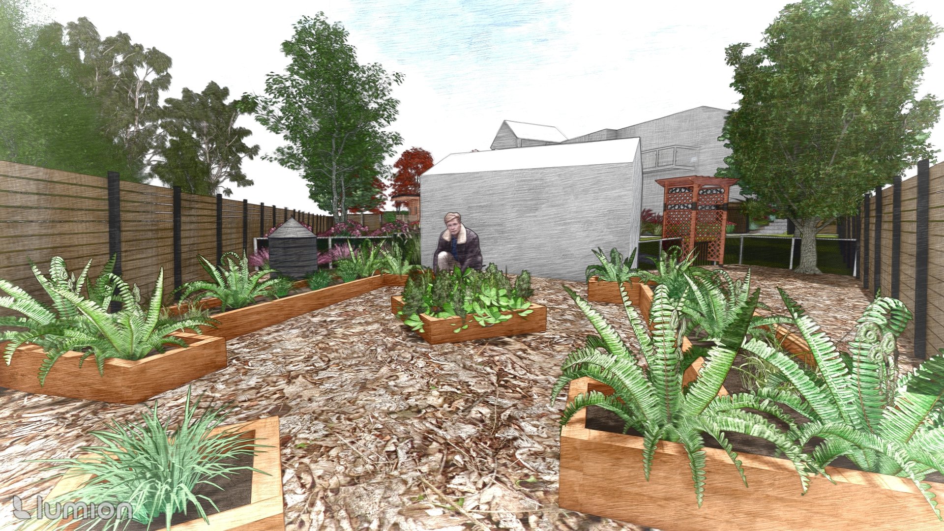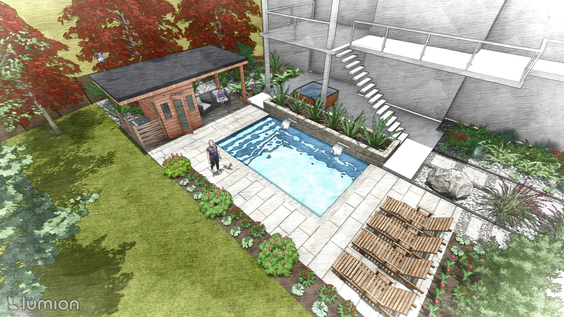 Here is the site fully rendered in Lumion. You can see the entrance to the site with the steps going down merging into the walkway stepping stones to the already existing porch. From the lower porch you have accesses on both sides to the pool and on one side of the pool is a half pergola - half pool storage with a space for the pool equipment at the side of it. On the other side of the pool we have lounge chairs and across more stepping stones is access to the firepit area. Past the firepit is access through an arbor into the chain link gated veggie garden that is positioned in full sun.