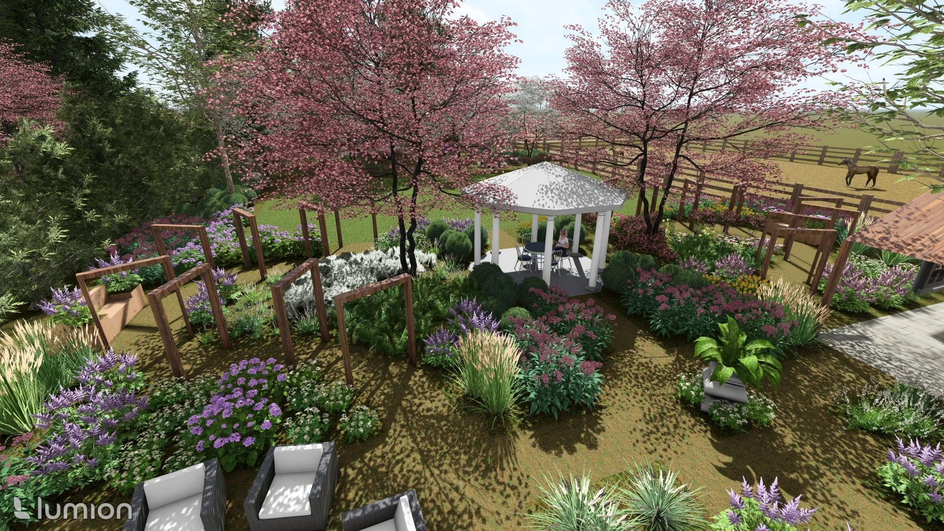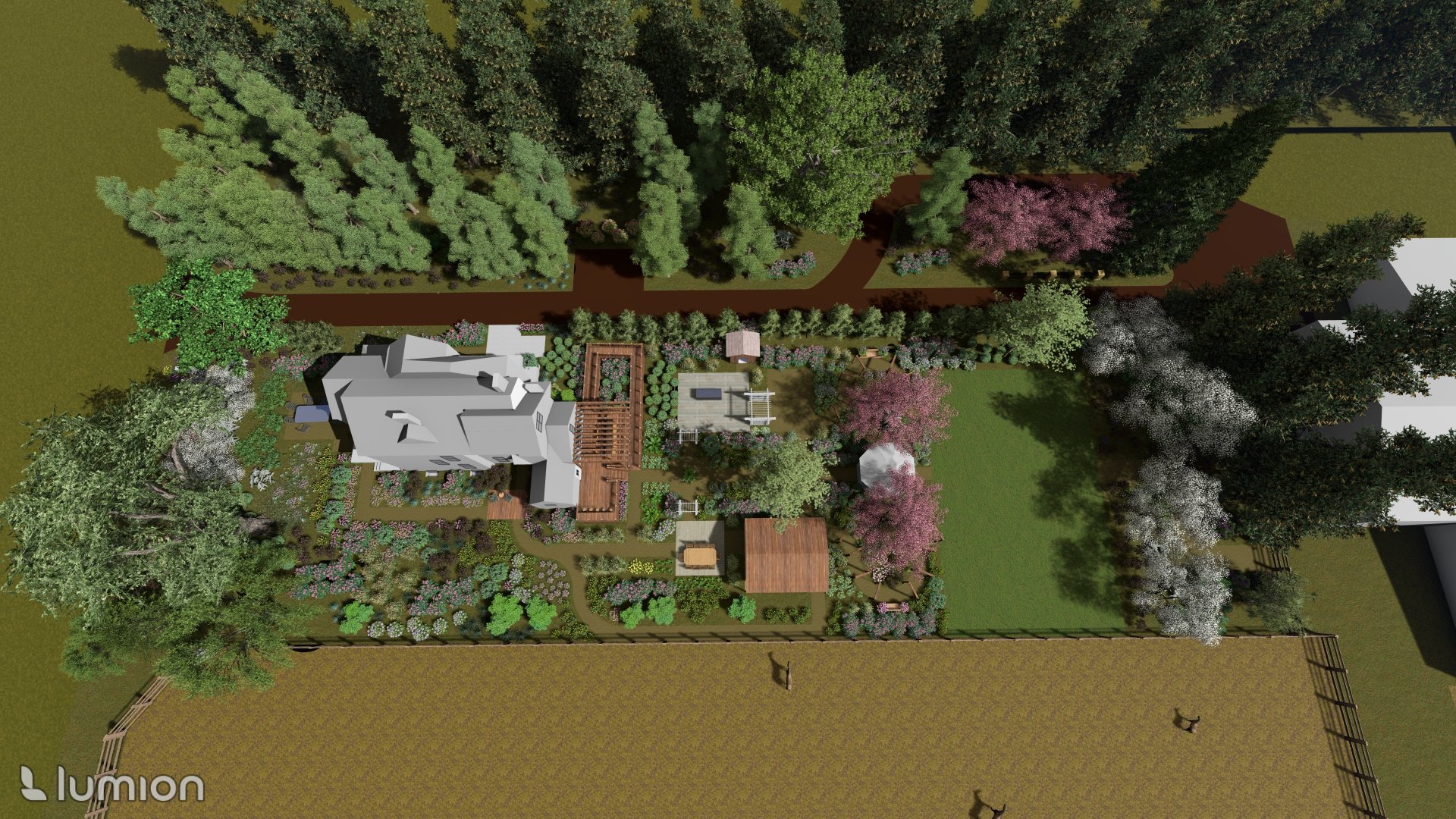 While approaching the open lawn area, there is a small hexagonal pavilion along the path with more seating to watch children’s activities on the grass. At the very back of the yard is additional seating for resting after lawn activities, and a wide pathway leading to the gate that accesses the horse stable and paddock entrance. This pathway is also wide enough to accommodate their large lawn mower.