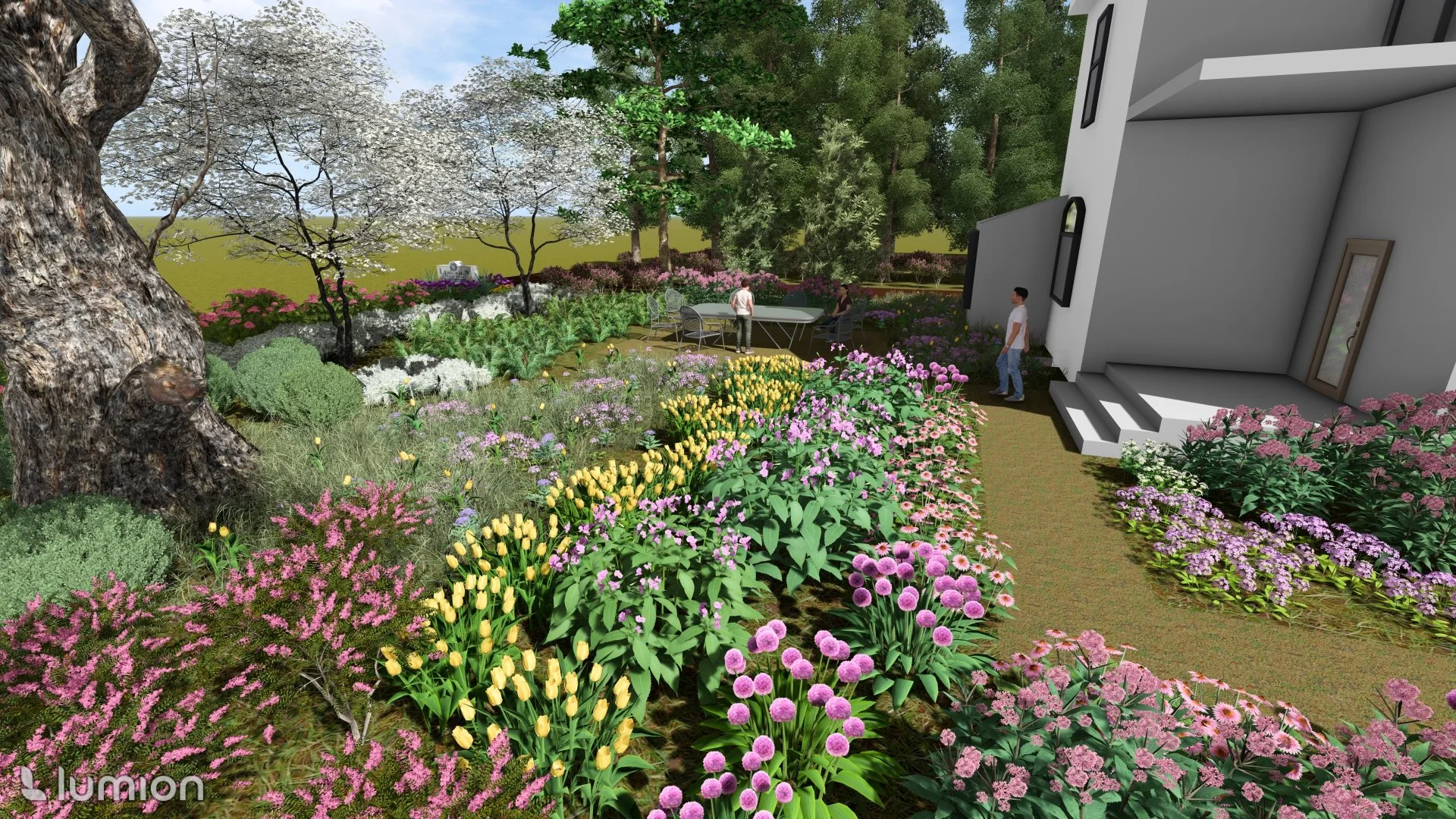 My design showcases colourful plants and trees that the client requested to encompass the front yard. The colours of the plants you see represent when they are in full bloom, in season. I included as many seating areas as possible to enjoy all aspects of this scenic space.